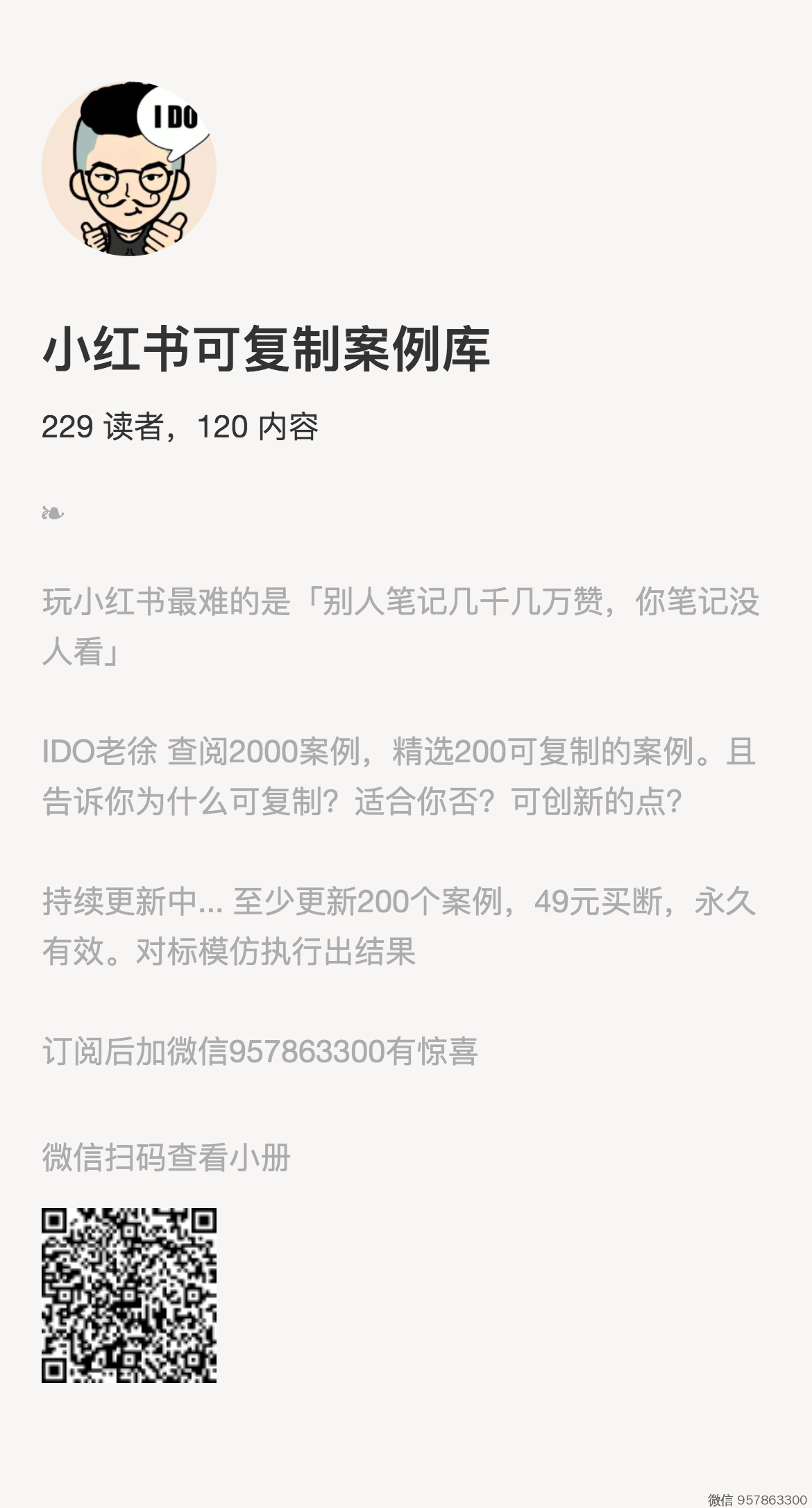 200 个案例 ,59 元(永久有效),由 IDO老徐 手工精选 200 个小红书可复制案例 。